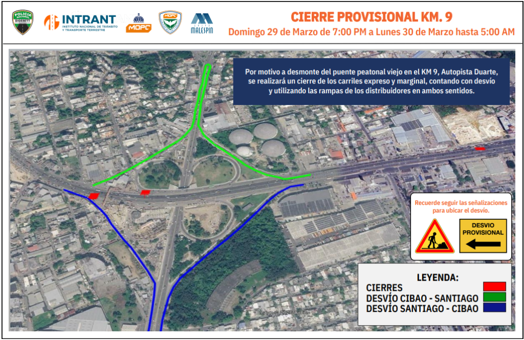 Santo Domingo. — El Ministerio de Obras Públicas y Comunicaciones (MOPC) informó que este domingo en horario nocturno se realizará el retiro del viejo puente peatonal en el Kilómetro 9 de la autopista Duarte, lo que implicará un cierre temporal de la vía y la aplicación de desvíos en la zona.