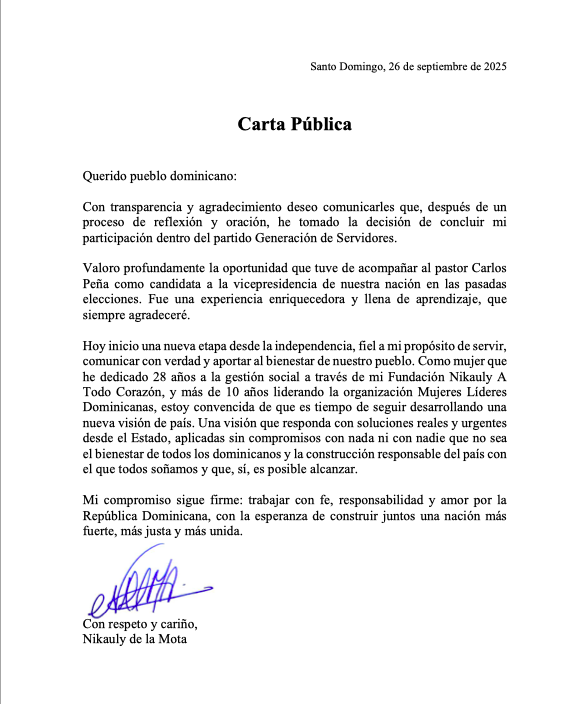 Santo Domingo, 26 de septiembre de 2025 – La reconocida líder social y política Nikauly de la Mota anunció hoy, con un mensaje cargado de reflexión y gratitud, su retiro del partido Generación de Servidores tras un proceso personal de oración y análisis. En una carta pública, destacó su experiencia como candidata a la vicepresidencia junto al pastor Carlos Peña en las elecciones pasadas, agradeciendo los aprendizajes adquiridos, y dio inicio a una nueva etapa como líder independiente.