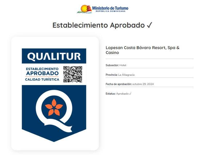 El reconocimiento es concedido por el MITUR, a través del Viceministerio de Calidad de los Servicios Turísticos, tras un proceso de evaluación que incluye inspecciones técnicas y verificación del cumplimiento de estándares establecidos. En el caso del Lopesan Costa Bávaro, la aprobación del proceso se produjo en octubre de 2024.